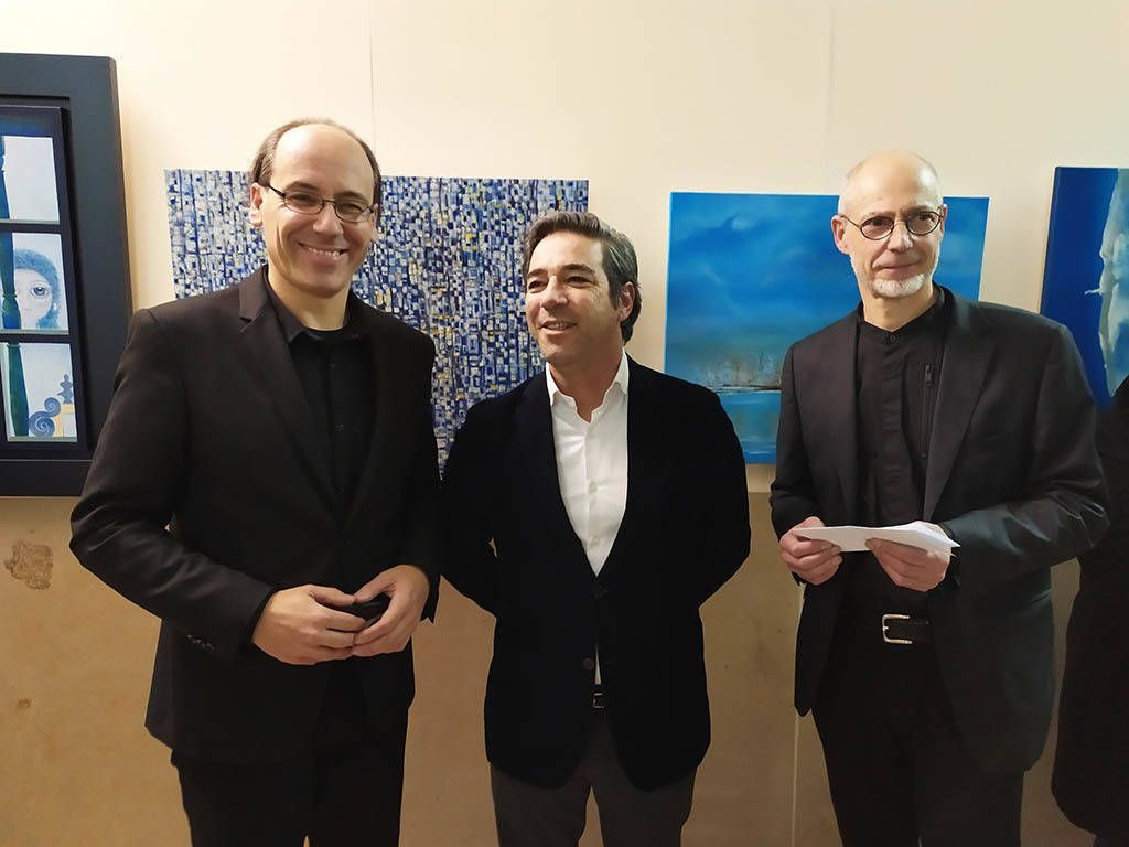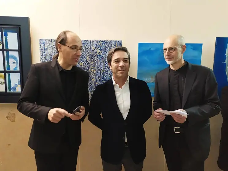 Nuno Soares (i), director de la Casa das Artes; el alcalde de Arcos de Valdevez, João Manuel Esteves, y el comisario de la exposición, António João Aguiar, momentos antes del inicio del evento. ![]()