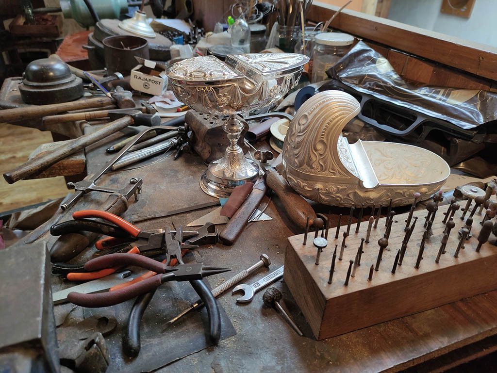 Julio Lado é a cuarta xeración desta familia numerosa de ourives. A mostra reúne unha selección de pezas realizadas por el ao longo da súa vida, “pezas dun elevado valor porque ninguén cincelaba nin repuxaba como el, é un auténtico mestre” -salientan as comisarias-. Tamén se amosan os debuxos orixinais das obras, o que permite coñecer como foi o proceso de traballo. Ademais, recreouse unha pequena parte dun taller cun tabliz -banco de traballo- con ferramentas tradicionais moi antigas, algunhas delas xa non existen e moitas ideadas pola propia familia.
