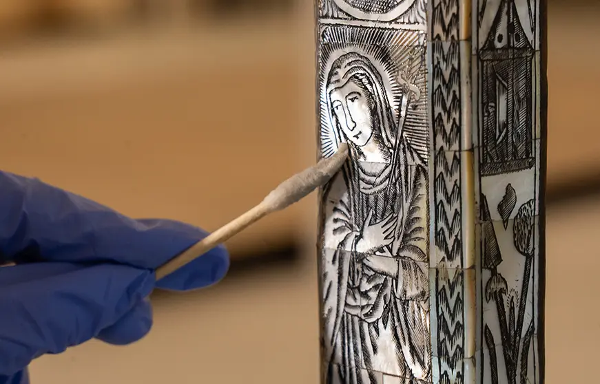Entre estas piezas gallegas, se encuentra también un conjunto de cuatro maquetas de madera y nácar, varias cruces y un *relicario de los mismos materiales, así como una pintura del siglo XVIII titulada San Francisco ante el altar de Santiago, de Plácido Fernández, todas ellas procedentes del Convento de San Francisco de Santiago de Compostela, que están siendo objeto de trabajos de limpieza y conservación por parte de personal técnico especializado del Museo Centro Gaiás. Además, se realizará la fijación de escamas de policromía desprendidas en el caso de la pintura, y la aplicación de un barnizado final que mejorará el aspecto y protegerá las obras de daños externos.