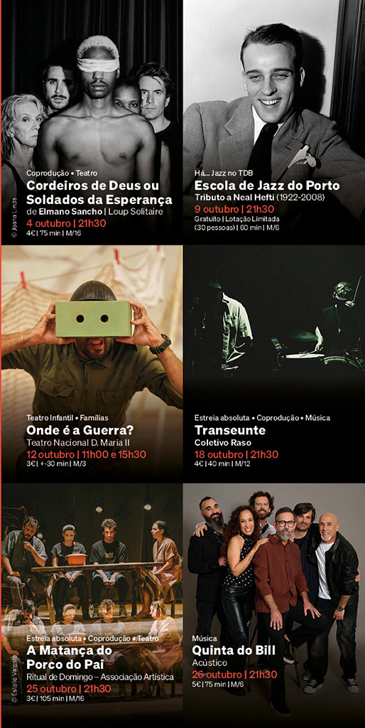 A programação musical também é rica e variada, com propostas que vão do jazz ao rock. A Escola de Jazz do Porto apresenta um tributo a Neal Hefti, enquanto o coletivo Raso, composto por artistas locais, estreia o espetáculo "Transeunte", uma jornada pela dicotomia realidade/imaginação. Para finalizar o mês, a banda Quinta do Bill traz um show acústico com um repertório exclusivo.