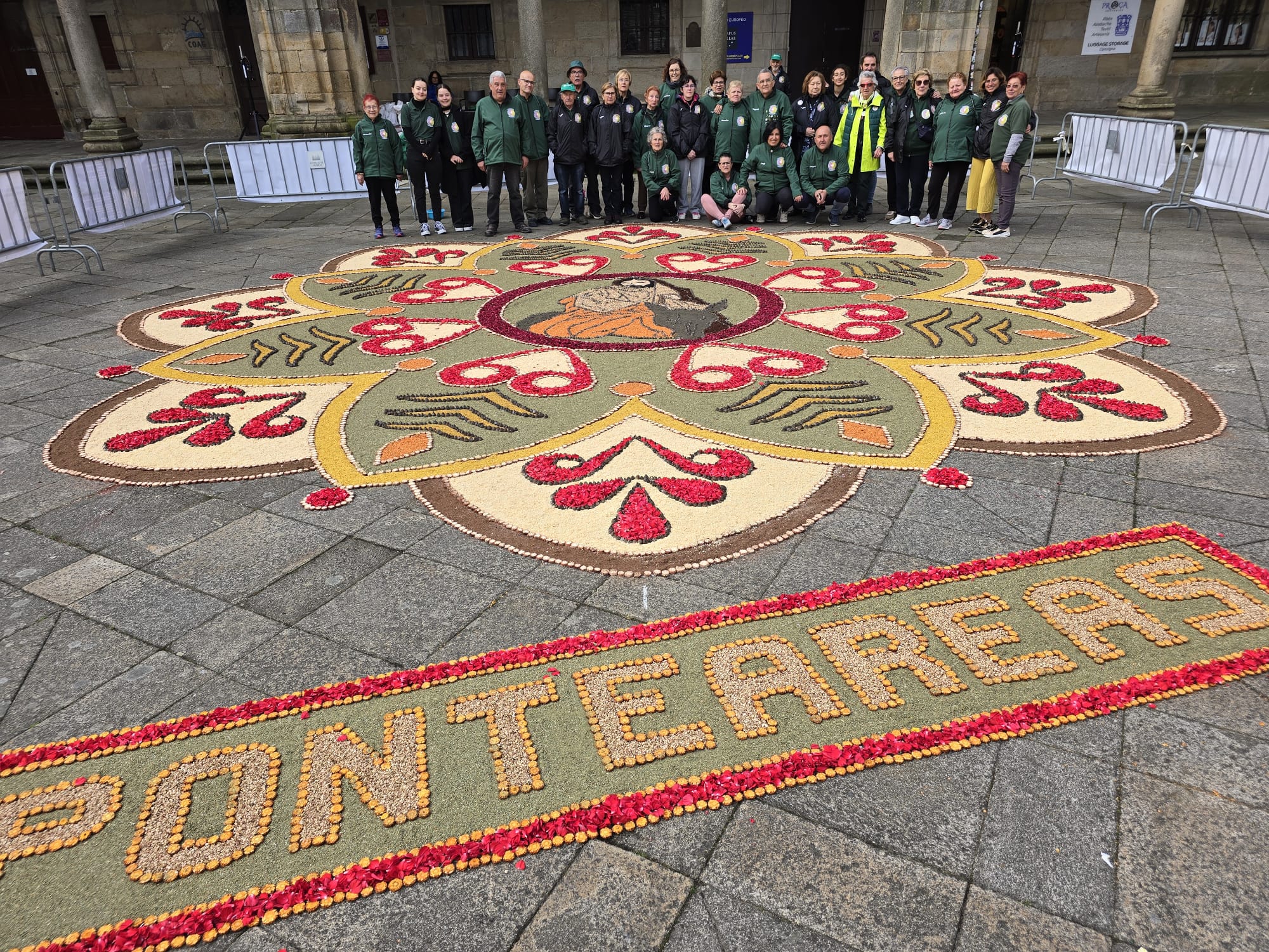 La Asociación de Alfombristas Do Corpus Christi de Ponteareas, atendiendo la invitación de la Junta de Cofradías y el Obispado de Santiago, confeccionó una espectacular alfombra floral el pasado Domingo de Ramos en la emblemática Plaza de la Quintana. La artística creación recibió a la solemne Procesión de la Borriquilla el domingo 13 de abril.