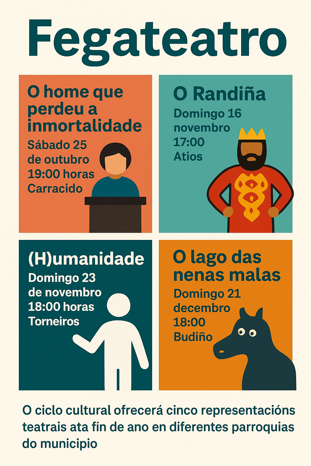 O Concello do Porriño vén de presentar unha nova edición do ciclo Fegateatro, que nesta ocasión ofrecerá cinco representacións teatrais en diferentes parroquias do municipio ata finais de ano. A iniciativa, consolidada xa como unha das citas culturais máis destacadas do outono, busca achegar as artes escénicas a todos os recunchos do concello, tamén ás zonas rurais.