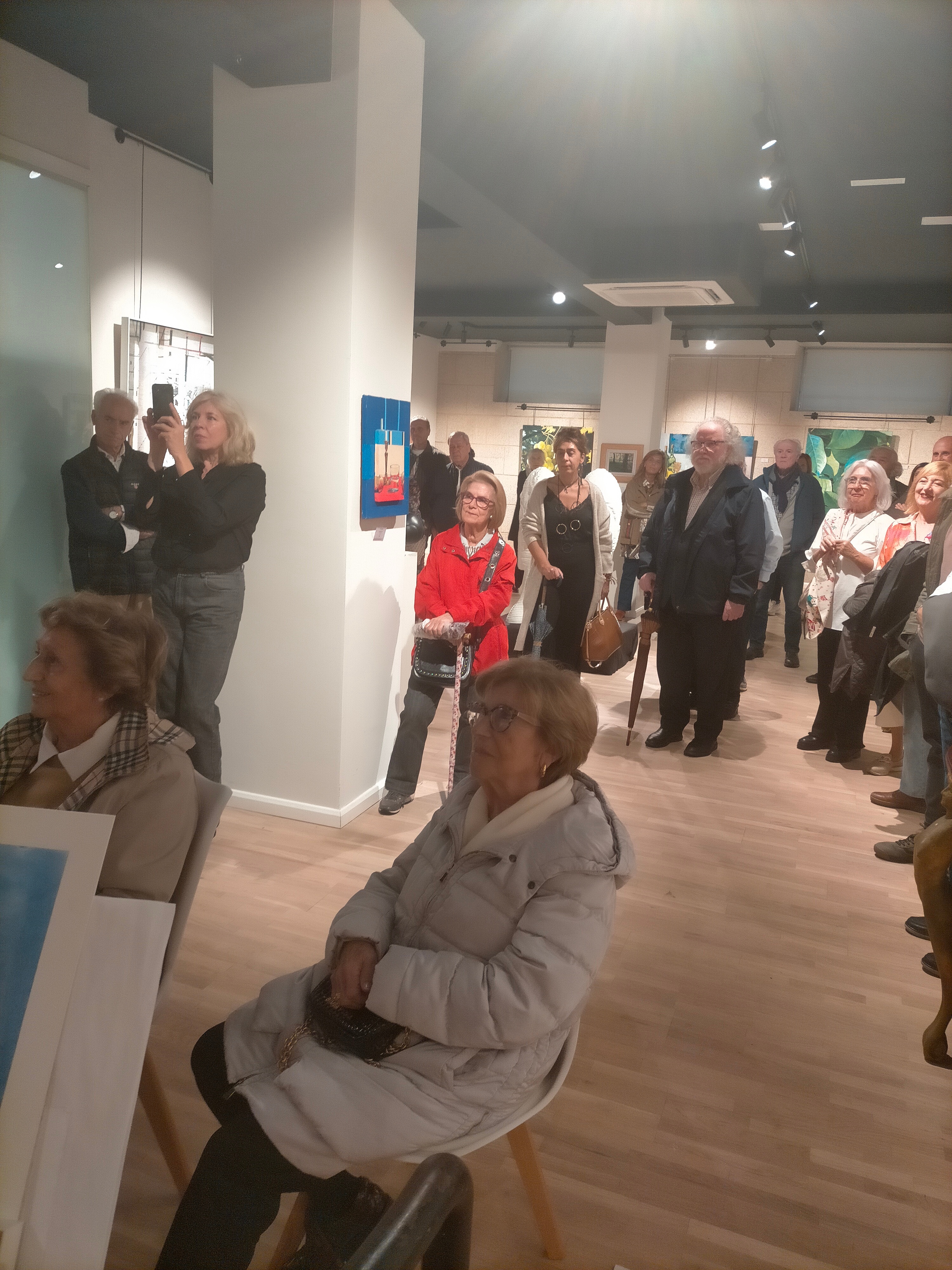 Durante la inauguración, estuvo rodeada de amigos, fundamentalmente creadores, entre los que se encontraban Antón Pulido, pintor de Amoeiro, en vísperas de recibir el Premio de la Crítica de Galicia, que llegó junto al inseparable amigo Bieito Ledo. Arroparon a Puri, Román Pereiro, fundador de Atlántica; la restauradora Virxinia Palacios; y Pepe Barreiro, procedente de su Cela, en la península del Morrazo, donde tiene su estudio, para no perderse el acontecimiento plástico.