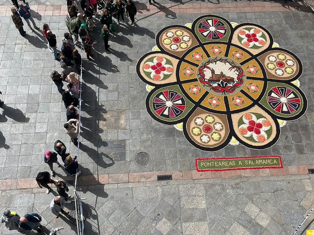 Una alfombra de nueve metros de diámetro y unos 70 metros cuadrados fue confeccionada esta mañana en la Plaza Mayor inspirada en motivos de Salamanca. El primero y que le da forma es el Botón Charro, donde alrededor de un círculo central se distribuyen 18 círculos que representan a las 18 cofradías, hermandades y congregaciones que componen la Junta de Semana Santa.