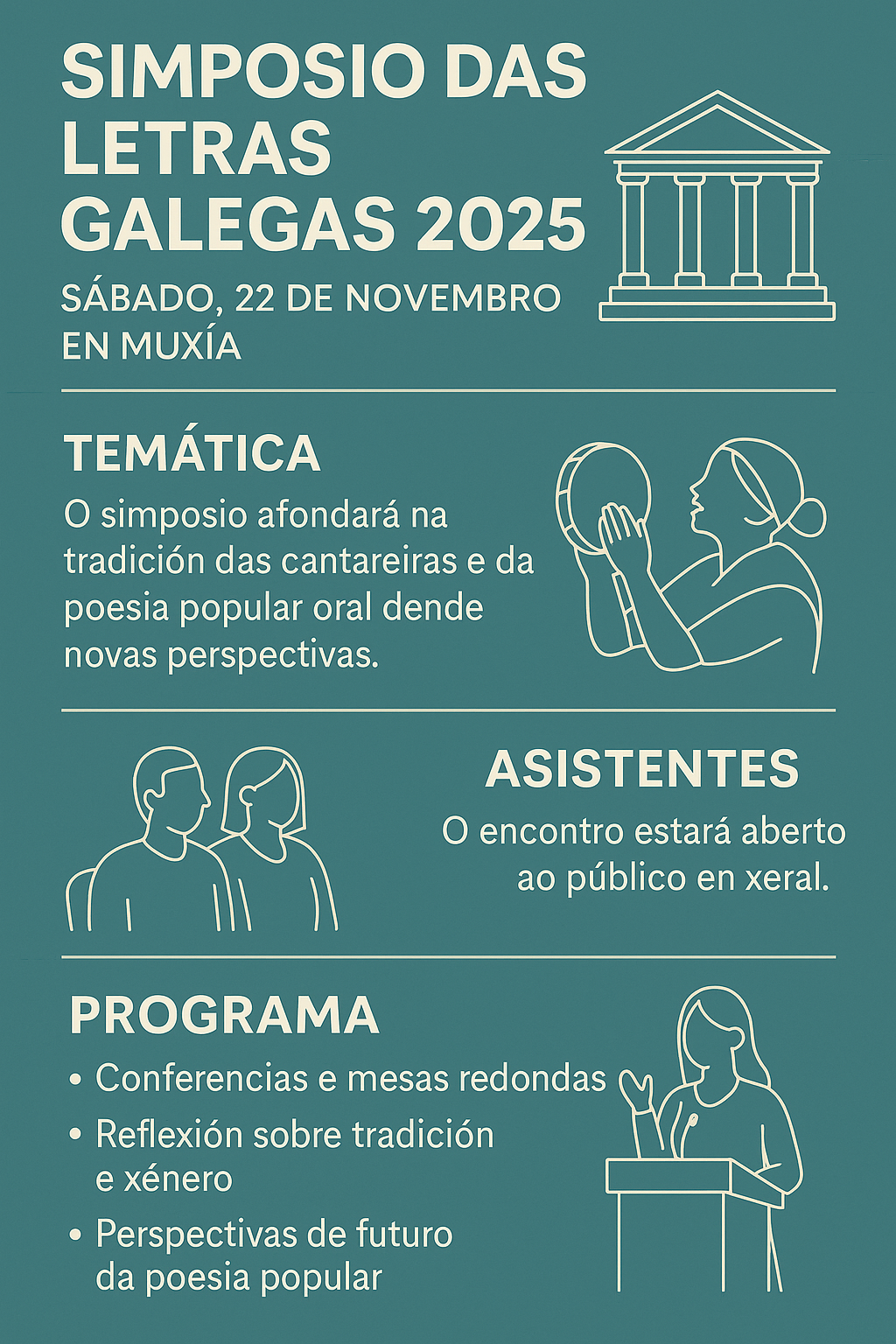 No treito final deste ano dedicado ás cantareiras e á poesía popular oral, a Real Academia Galega porá o ramo á conmemoración cunha xornada de análise e reflexión desde unha ollada contemporánea. O Simposio das Letras Galegas 2025 terá lugar o sábado 22 de novembro en Muxía, vila natal dunha das sete homenaxeadas deste ano, Eva Castiñeira, e celebrarase cun programa aberto ao público que se estenderá ata o 31 de decembro, data de peche oficial da celebración.