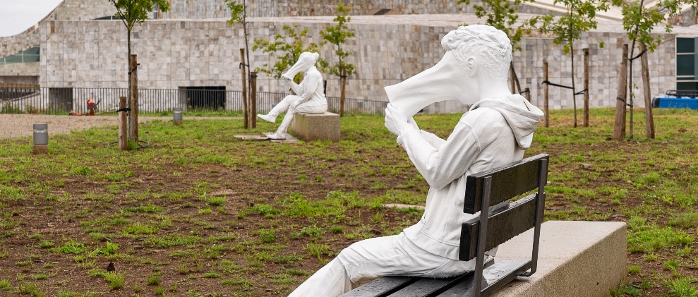 Partiendo de las ideas del filósofo surcoreano Byung-Chul Han alrededor de la alienación provocada por el abuso de las nuevas tecnologías, el artista gallego presenta tres figuras, hombres y mujeres sosteniendo el móvil, con sus rostros desfigurados en un mimetismo total con la pantalla del teléfono, llegando incluso a dar la espalda a la vista de las torres de la Catedral de Santiago que se puede contemplar desde la cumbre del Gaiás.