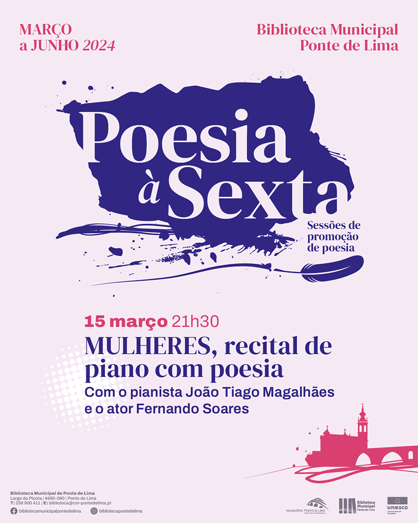 Esta ação que aglutina as comemorações do Dia da Mulher e do Dia Mundial da Poesia será realizada na Biblioteca Municipal e desenvolvida com mestria pela mão do pianista João Tiago Magalhães, acompanhado pela voz do ator Fernando Soares.