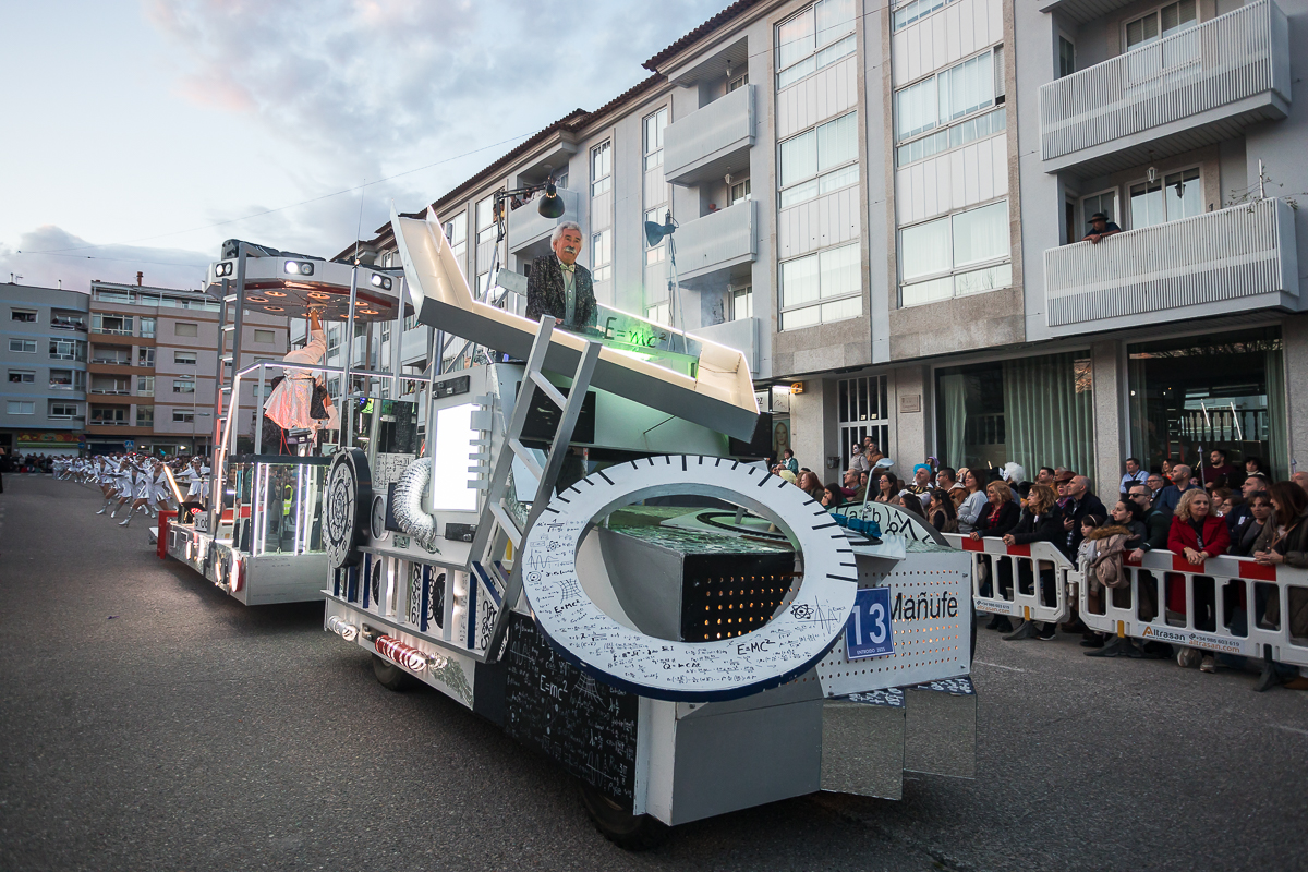 La comparsa "Relativerso" de la Asociación Carnavales de Mañufe se alzó como la gran triunfadora de la jornada, llevándose el primer premio absoluto, el segundo premio en carrozas y el premio a la mejor música. Su propuesta, inspirada en la teoría de la relatividad de Einstein y con una estética que evocaba a Kubrick y Dalí, cautivó al público y al jurado por igual.