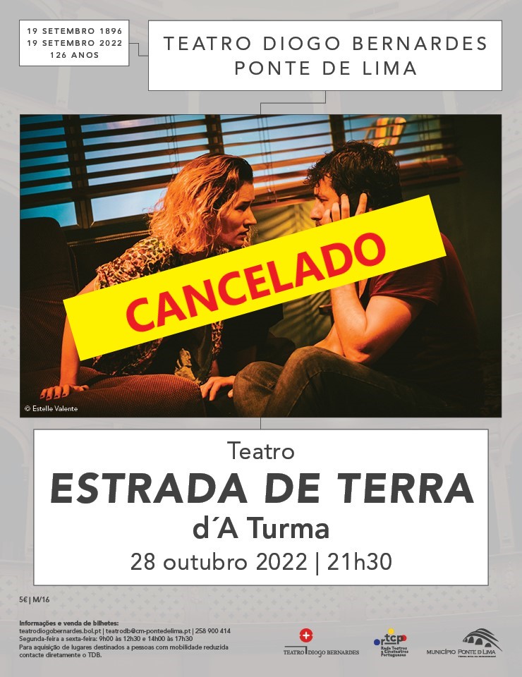 A programação cultural de um Teatro está sujeita a imponderáveis de diversa natureza. O Teatro Diogo Bernardes não é exceção. Lamentamos informar que devido à lesão sofrida por um membro do elenco da Companhia “A Turma”, o espetáculo “Estrada de Terra”, que iria ocorrer no Teatro Diogo Bernardes no próximo dia 28 de outubro, pelas 21h30, foi cancelado. Atempadamente será comunicada nova data de reagendamento.