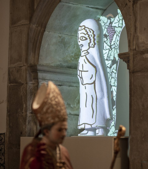 Um jovem e imberbe São Vicente, patrono dos vinhateiros, segura um precioso cacho de uvas junto ao coração; São Tiago a pintar, com o santo braço que aqui trazemos, o “Bago” que se torna vinho; São Martinho, pelas mãos dos Mestres de Ferreirim, a habitar a entrada da nave dos Capuchos; uma instalação vídeo que mergulha num cubo para nos mostrar como os Monges “oram e laboram”, cuidando da alma, metem bem as mãos na massa terrena; o encantado e encantador olhar fotográfico de Domingos Alvão sobre os instrumentos e momentos que fazem o vinho ser vinho.