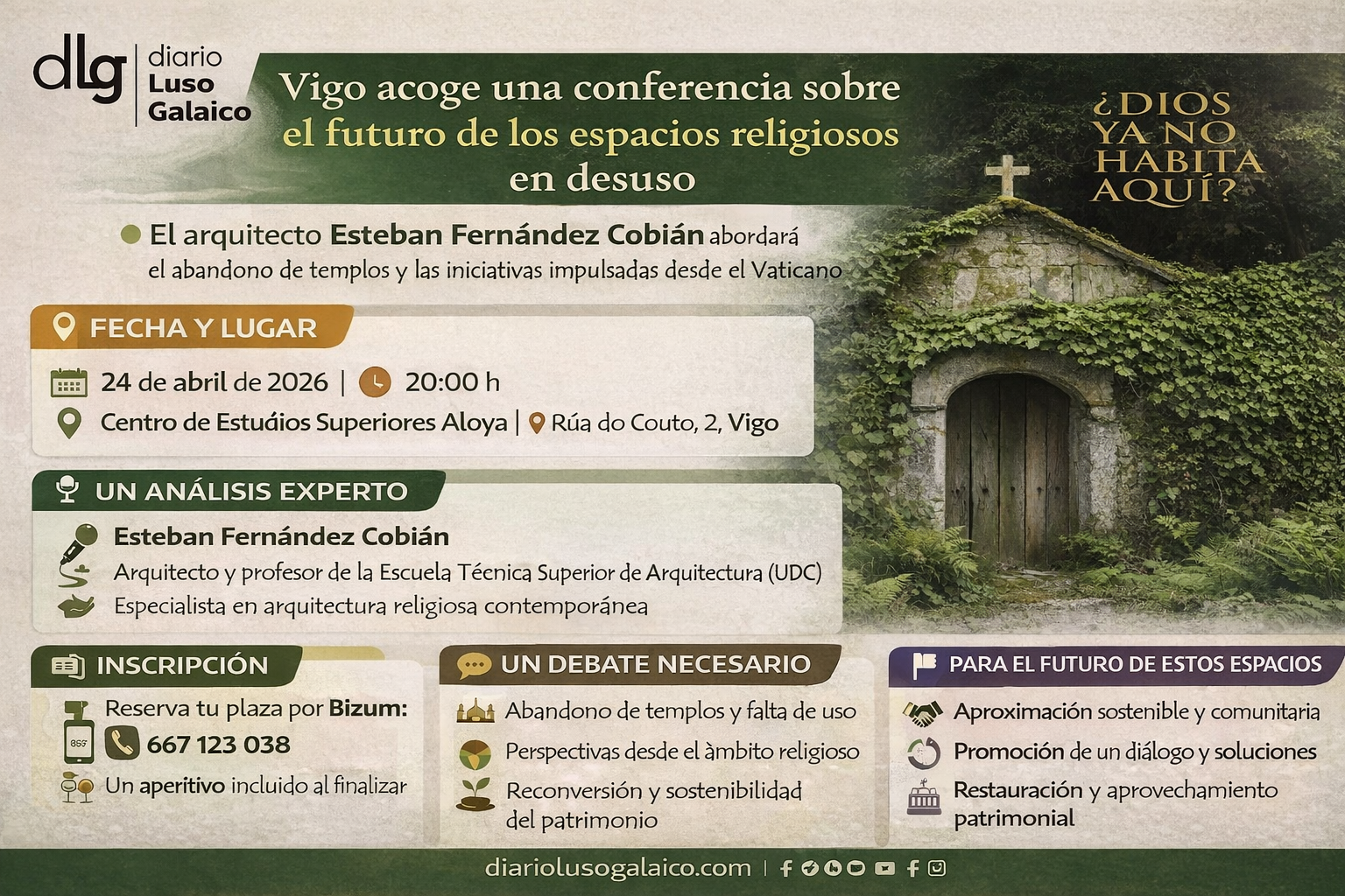La conferencia se presenta como una oportunidad para reflexionar sobre el papel de los espacios religiosos en la actualidad y su posible reconversión, en un contexto marcado por el cambio de usos, la despoblación y la transformación social.