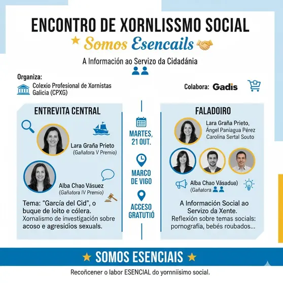 VIGO. O Colexio Profesional de Xornalistas de Galicia (CPXG) e Gadis organizan o vindeiro martes 21 de outubro o Encontro de Xornalismo Social "Somos Esenciais" no salón de actos do MARCO de Vigo (Rúa do Príncipe, 54), a partir das 19:00 horas. O evento, gratuíto e aberto ao público, busca reflexionar sobre a relevancia da información que se pon ao servizo da cidadanía e aborda as problemáticas da sociedade.