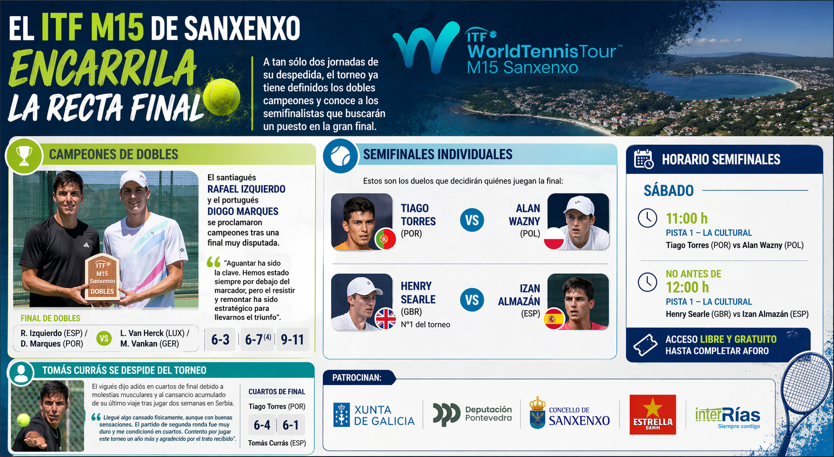 El ITF World Tennis Tour M15 de Sanxenxo entra en su fase decisiva a falta de dos jornadas para el cierre. Con el cuadro de dobles ya resuelto, todas las miradas están puestas en las semifinales individuales que se disputan este sábado.
