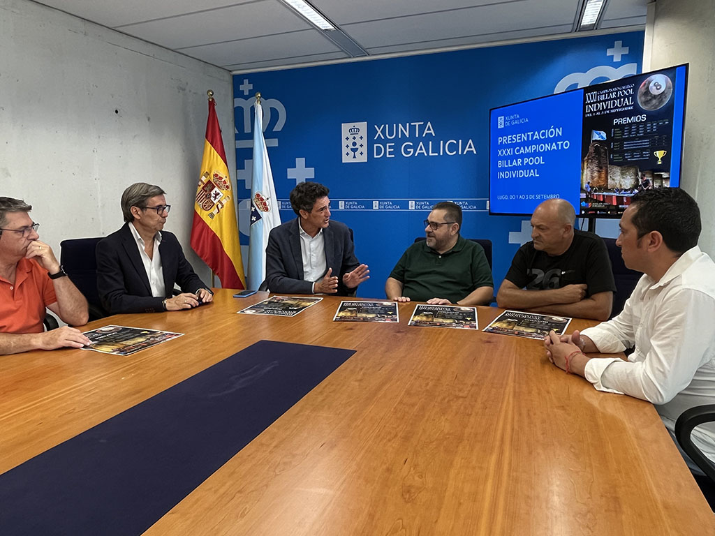 El delegado territorial de la Xunta en Lugo, Javier Arias, acompañado de miembros de la Asociación Gallega de Billar Pool, presentaron el XXXI Campeonato Gallego Billar Pool Individual que se disputará desde el viernes 1 al domingo 3 de septiembre en el Pazo de Feiras de Lugo.