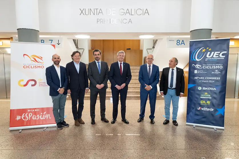 En la reunión de trabajo, Alfonso Rueda estuvo acompañado por el vicepresidente segundo y conselleiro de Presidencia, Xustiza e Deportes, Diego Calvo, y por el secretario xeral para o Deporte, José Ramón Lete. En el encuentro participaron representantes de las federaciones internacional, española y gallega de ciclismo, así como del Club Rías Baixas, que asistieron con motivo del próximo congreso anual de la Unión Europea de Ciclismo (UEC) que se celebrará en Santiago en 2024 para convertir a la capital de Galicia en el epicentro continental del ciclismo.
