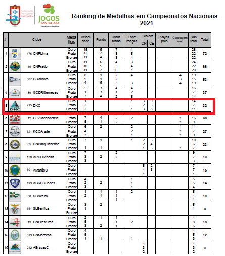 Assim, é o quinto clube nacional com mais medalhas de ouro em campeonatos nacionais, em número de catorze. De prata foram sete e de bronze onze. No total em campeonatos nacionais a DKC de Viana conquistou 34 medalhas em 2021.