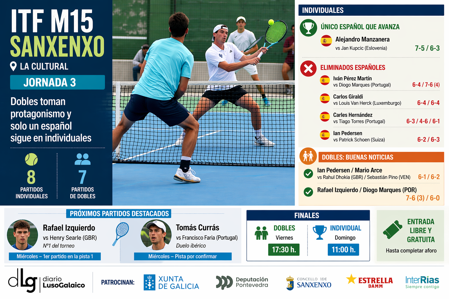 La tercera jornada del ITF World Tennis Tour M15 de Sanxenxo se cerró con el programa completo en La Cultural, en un día marcado por el protagonismo del cuadro de dobles y un alto ritmo de partidos: 8 encuentros individuales y 7 de dobles.