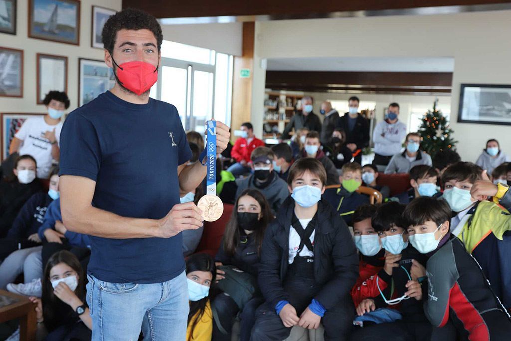El medallista olímpico de la clase 470 en los Juegos de Tokio, Nicolás Rodríguez, ha sido el centro de atención de la segunda jornada del Clinic de Navidad de la Clase Optimist, en el que cerca de un centenar de jóvenes regatistas de todo el noroeste español, que está organizando uno de los clubes que más trabaja por la cantera en toda España: el Club Marítimo de Canido.