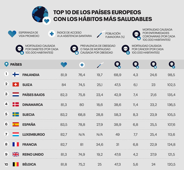 El mejor país para vivir de forma saludable, sin embargo, es Finlandia, donde el tiempo dedicado a actividades físicas es alto y las tasas de mortalidad causadas por diabetes y enfermedades cardíacas son bajas. Quizás no sea una coincidencia que el nivel de felicidad en este país nórdico sea el más alto de todos los países del estudio, aunque su esperanza de vida sea ligeramente inferior a la de Suiza y Suecia.