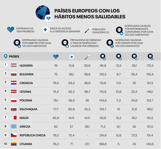 El último país de la clasificación es Hungría, donde la mortalidad por cáncer llega a 175 personas por 100.000 habitantes, niveles de obesidad que se ubican entre los más altos de Europa (superados solo por Malta) y un acceso mínimo a la atención médica.