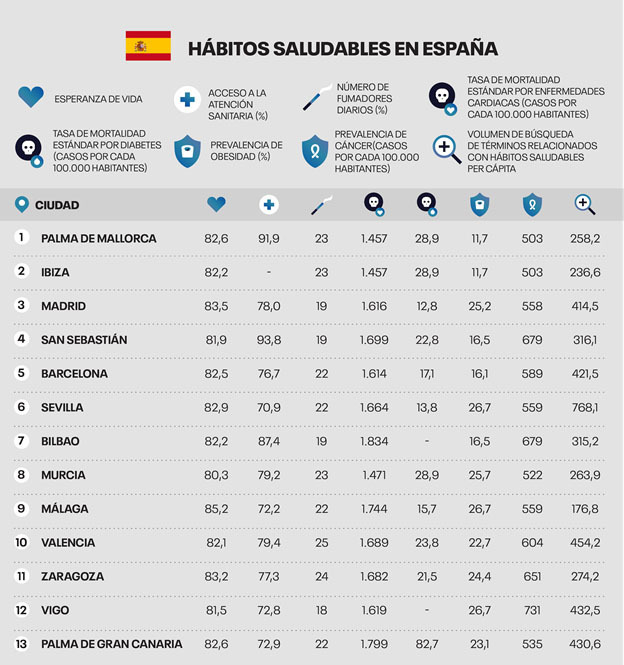 En el extremo opuesto de la tabla, Palmas de Gran Canaria presenta la tasa más alta de mortalidad causada por diabetes, así como una de las tasas de mortalidad más altas por enfermedades cardíacas y uno de los menores porcentajes de acceso a la atención sanitaria.