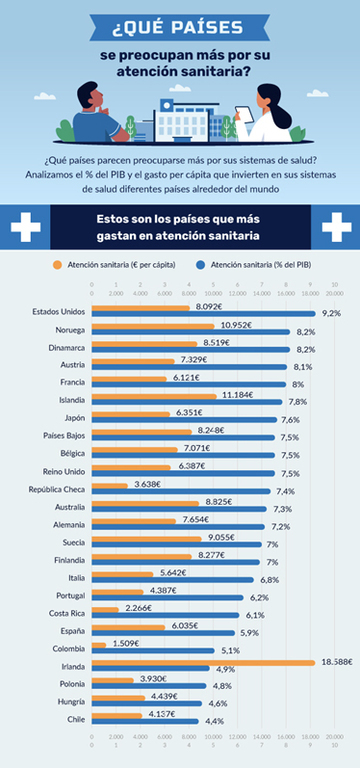 Clasificación País Atención sanitaria Per Cápita (€) Gasto médico como parte del PIB (%) 1 Irlanda €18.588,88 4,9% 2 Islandia €11.184,67 7,8% 3 Noruega €10.952,14 8,2% 4 Suecia €9.055,24 7% 5 Australia €8.825,18 7,3% 6 Dinamarca €8.519,67 8,2% 7 Finlandia €8.277,84 7% 8 Países Bajos €8.248,07 7,5% 9 Estados Unidos €8.092,01 9,2% 10 Alemania €7.654,60 7,2% 11 Austria €7.329,01 8,1% 12 Bélgica €7.071,80 7,5% 13 Reino Unido €6.387,77 7,5% 14 Japón €6.351,30 7,6% 15 Francia €6.121,93 8% 16 España €6.035,82 5,9% 17 Italia €5.642,60 6,8% 18 Hungría €4.439,49 4,6% 19 Portugal €4.387,88 6,2% 20 Chile €4.137,99 4,4%