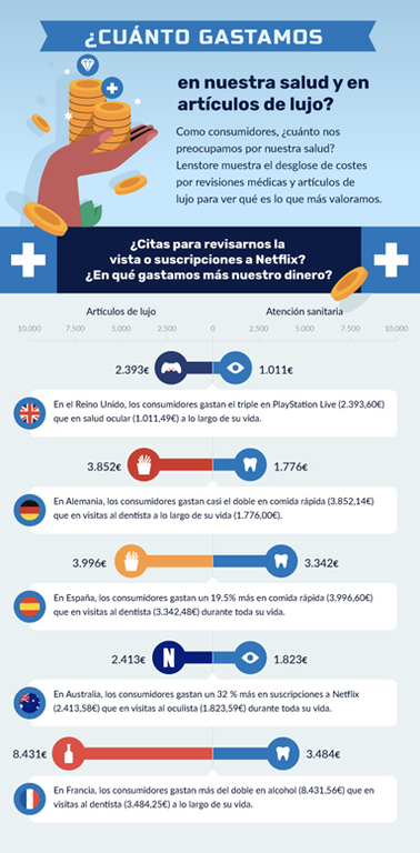 Esta tendencia se manifiesta también en países como Irlanda, España y Australia, donde el coste de las suscripciones a Netflix y Playstation Live supera con creces el coste de las citas para exámenes oculares. ¿Esto demostraría que los consumidores valoran más los artículos de lujo o secundarios que su propia atención médica? Te dejamos decidir.
