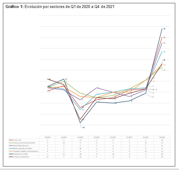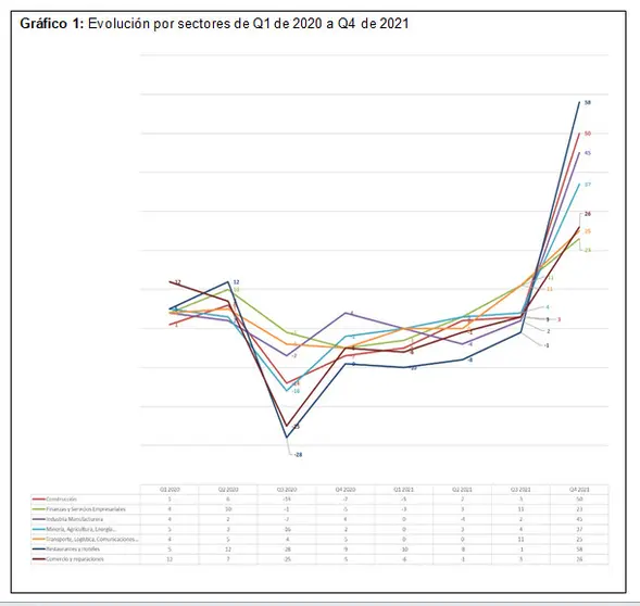 Cabe resaltar también el optimismo de otros sectores de la economía de Asturias, Castilla y León y Galicia, como es la Industria Manufacturera (+45%), la Minería, Agricultura y Energía (agrupadas en Otras Industrias, con un 37% en expectativa de generación de empleo neto); Comercio (+26%) y Actividades Sociales, Transporte, Logística y Comunicaciones (agrupadas en Otros Servicios, con un 25% de crecimiento) y, finalmente, Finanzas y Servicios Empresariales, con un 23%. Todos ellos habían reflejado una mejoría lenta pero constante en el último año, si bien es en Q4 cuando su proyección de generación de empleo se multiplica tajantemente.