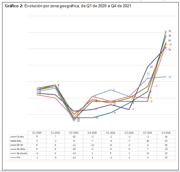Así, la Zona Centro une Madrid y Castilla La Mancha; Zona Norte incluye Aragón, Cantabria, La Rioja, Navarra y País Vasco; Zona Noreste agrupa Cataluña e Islas Baleares; la Zona Sur aglutina Andalucía, Extremadura e Islas Canarias; la Zona Este equivale a Levante (Comunidad Valenciana y Murcia); y, finalmente, la Zona Noroeste reúne Asturias, Castilla y León y Galicia. Éste es precisamente el orden en cuanto a expectativa de generación de empleo neto que identifica el Estudio de ManpowerGroup para Q4 de 2021: los directivos de la Zona Centro, los más optimistas, confían ampliar sus equipos en un 41% de media, seguidos por los empresarios de la Zona Norte, con un +38%; de la Zona Noreste (34%), Sur (33%), Este (31%) y Noroeste (13%).