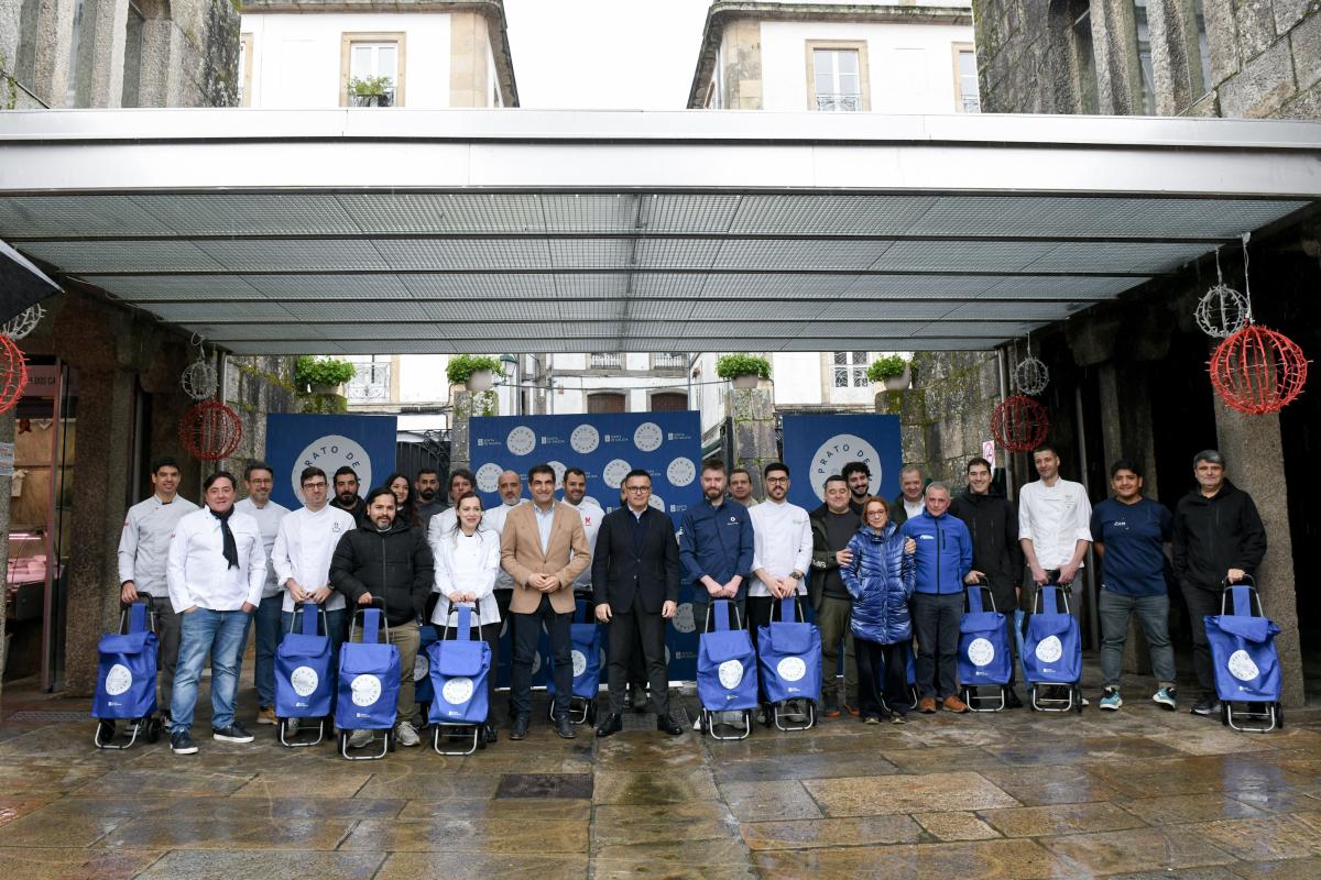 La Plaza de Abastos de Santiago fue esta mañana el escenario de la presentación de Plato de Mercado, un nuevo proyecto impulsado por la Xunta de Galicia con el objetivo de reforzar el papel de las plazas y mercados como escaparates del producto gallego de calidad, fresco y de proximidad. El conselleiro de Emprego, Comercio e Emigración, José González, acompañado por el director general de Comercio y Consumo, Gabriel Alén, presidió el acto, en el que participaron 34 chefs gallegos de 31 establecimientos de restauración, unidos para estrechar la relación entre cocina y mercado y potenciar estos espacios como motores económicos y sociales de las ciudades y villas gallegas.