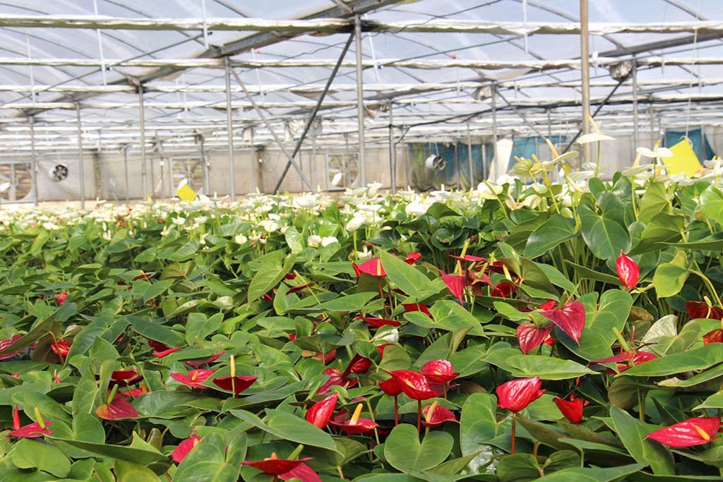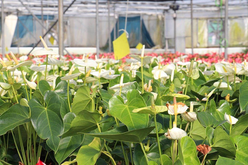 Solo para el cultivo del Anthurium, Viveros San Campio dedica una hectárea y media de invernaderos donde se reproducen las condiciones climatológicas precisas para estas plantas tropicales, originarias sobre todo de Colombia. Los sistemas de refrigeración consiguen mantener temperaturas de unos 20 grados. Temperaturas por encima de los 30 grados dañan seriamente el cultivo del Anthurium, explica Paula Salgueiro. Tampoco se deben exponer directamente a los rayos solares. Un conjunto de persianas en los techos los invernaderos evitan los rayos solares para estas plantas.
