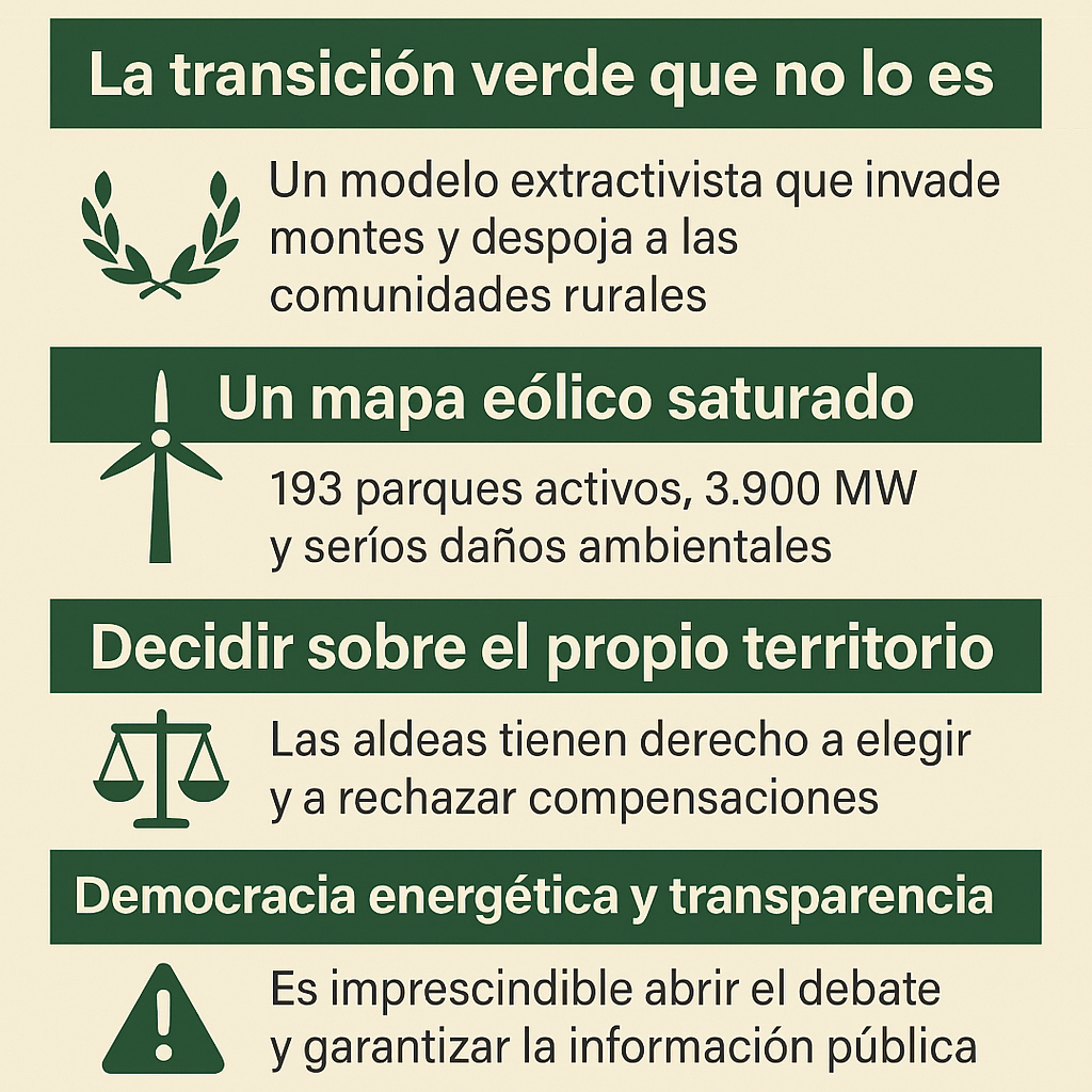 Estamos ante una nueva colonización rural: empresas que ocupan montes y sierras, aldeas atravesadas por infraestructuras, territorios transformados sin participación vecinal. La transición ecológica no puede ser el enésimo pretexto para profundizar desigualdades.