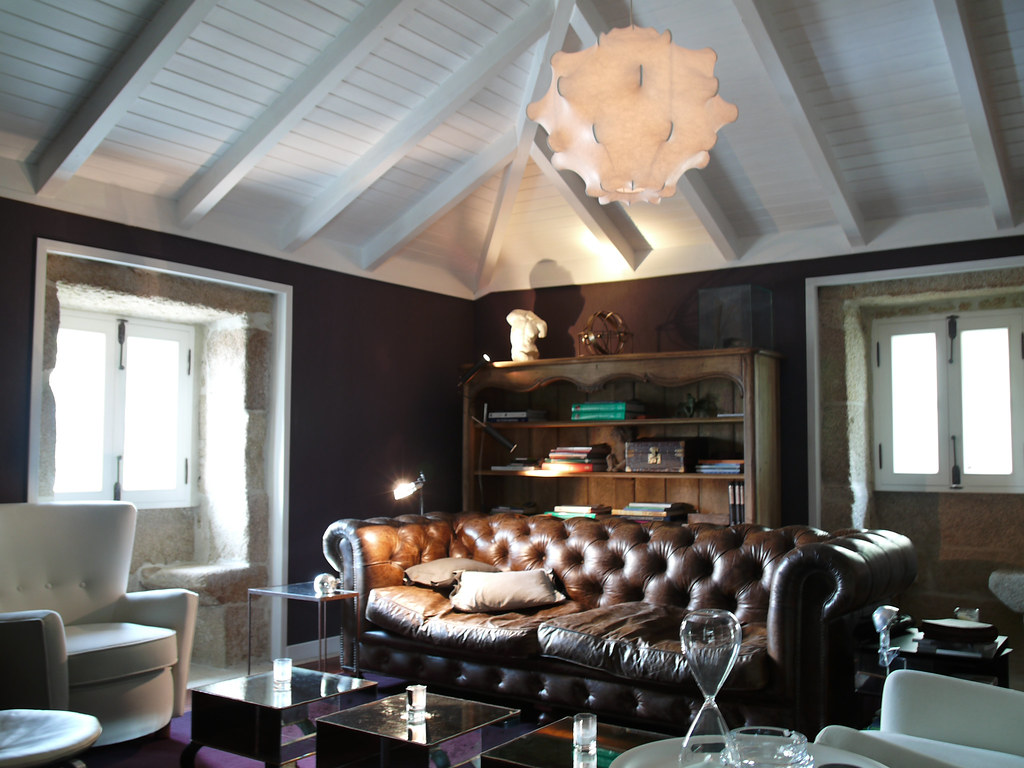 Unos escalones, una piscina de agua salada, un palomar habitación, una showroom que se prolonga en mesa exterior, al fondo el susurro del agua. Si se asciende un poco, una mini bodega. Tras bajar una sinuosa pero cómoda escalera, un paseo para dejarse enamorar. Aquí una coqueta sauna, allá un cobertizo con un saco de boxeo y bicicletas. En plena naturaleza, un jardín casi inglés con porche. Además: una sala de estar con chester, un primer comedor en dos alturas con chimeneas, otra cocina con comedor adosado al aire libre. Es todo una invitación a la intimidad permanente entre flores, perfumes naturales de jazmín o de nardos, paseos bajo vides, leñeras de diseño en forma de copas, cenadores, ventanas venecianas o inglesas, galerías impolutas que tamizan la luz única de las Rías Bajas, paredes abiertas al Sur forradas de conchas de vieiras, esculturas, muebles de diseño, bibliotecas y libros maravillosos, y cortinas y linos y esculturas y lámparas exclusivas, y una coqueta recepción, un corredor con banco y muebles que habitan habitaciones únicas.... y, de nuevo, el silencio acompasado con el sonido sinuoso del agua, y hortensias, y sillones y piedra y maderas y velas, y camelias y otros árboles...