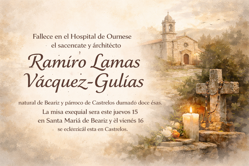 En la mañana de la víspera de su ochenta y dos cumpleaños ha fallecido en el Hospital de Ourense el arquitecto y sacerdote Ramiro Lamas Vázquez-Gulías, después de una larga enfermedad que le había alejado desde el pasado año del ejercicio del ministerio sacerdotal en esta diócesis y de su parroquia de Castrelos. Por deseo de la familia el velatorio se ha establecido en el Tanatorio de Magros y la misa exequial se celebrará a las 16 horas del jueves día 15 de enero en el templo parroquial de Santa María de Beariz, tras la cual su cuerpo será inhumado en el panteón familiar del cementerio de dicha parroquia.