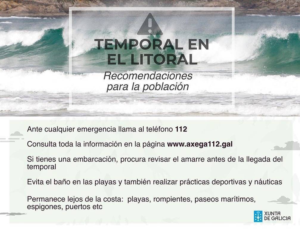 A Xunta lembra a importancia de manterse afastado da liña de costa, isto é, diques, rompentes, paseos marítimos. Tamén se recomenda que se extremen as medidas de seguridade á hora de realizar calquera actividade no mar e que se revisen os cabos e amarres das embarcacións .Ademais, aconséllase consultar a páxina web do CIAE 112, que conta con información meteorolóxica e con enlaces de interese.