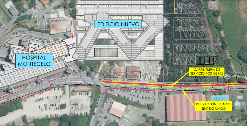 La intervención obligará a restringir el tráfico a un solo carril de circulación en la avenida Montecelo desde la rotonda del Príncipe Felipe hacia el actual hospital, y afectará a todo el tramo hasta el encuentro con la bajada de vehículos que dan acceso a la entrada del actual complejo.