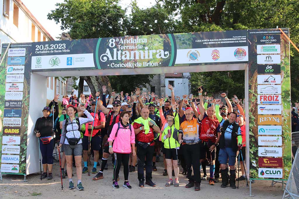 Un total de 650 persoas tomaron ás 9:00 horas de hoxe sábado a saída da VIII Andaina Terras de Altamira, organizada pola asociación O Esquío no Piñeiro e o Concello de Brión e que se desenvolverá ata as 21:00 horas polos montes e aldeas do municipio. Un total de 50 quilómetros que discorren por percorridos practicamente inéditos, fuxindo do asfalto e buscando novos sendeiros.