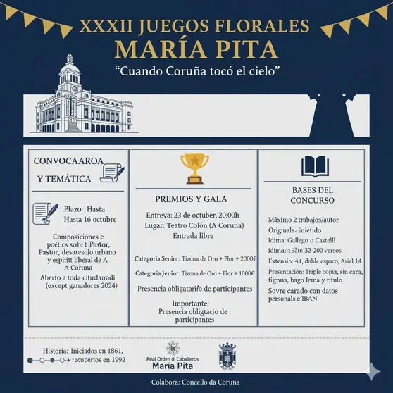 La Real Orden de Caballeros de María Pita mantiene abierto hasta el próximo 16 de octubre el plazo para la presentación de trabajos a los XXXIII Juegos Florales María Pita. Esta edición rinde homenaje a un hito arquitectónico de la ciudad con el lema: “Cuando Coruña tocó el cielo”, en alusión al centenario del edificio del Banco Pastor, que fue considerado el más alto de España en el momento de su construcción.