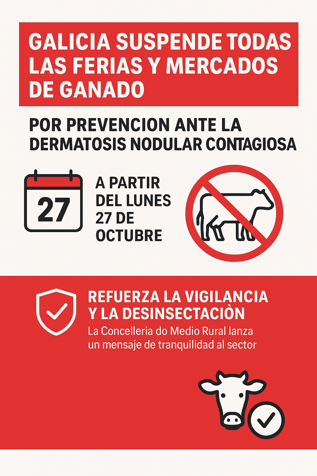 La Consellería do Medio Rural ha anunciado la suspensión, a partir del lunes 27 de octubre, de todas las ferias, certámenes, subastas, mercados y concentraciones de ganado en Galicia como medida preventiva frente a la dermatosis nodular contagiosa (DNC).