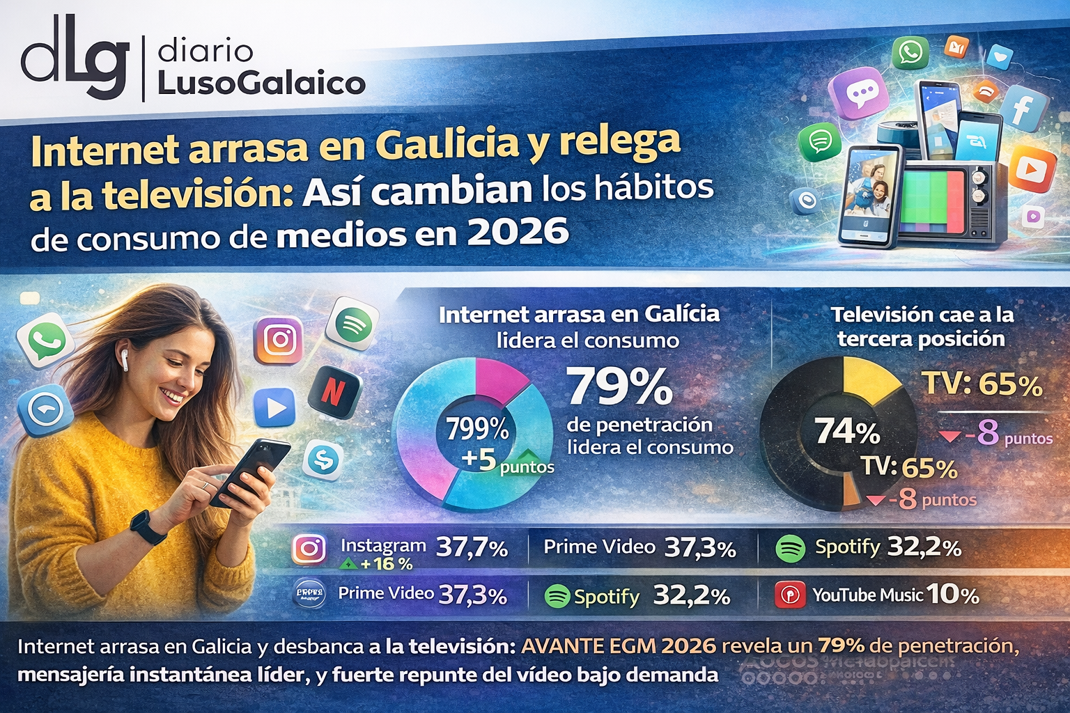 El mapa del consumo de medios en Galicia vive una transformación profunda. Internet no solo se consolida como el canal dominante, sino que amplía su ventaja frente a los soportes tradicionales, en un contexto en el que la digitalización redefine la forma en que los gallegos se informan, se entretienen y se comunican.