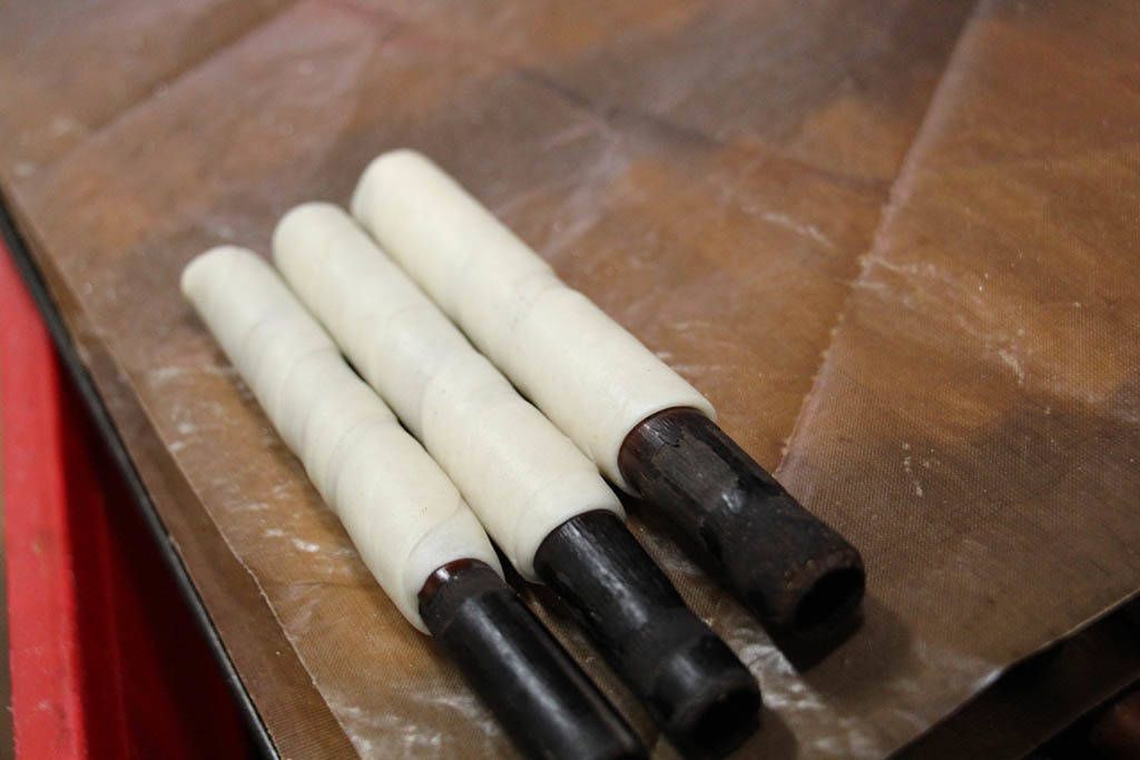 un rodillo. La masa fina se enrolla en una caña de cañaveral (no valen las de