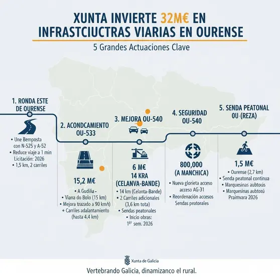 Mejora de la OU-540 (Celanova-Bande) ($6$ M€): Autorizada la contratación para el primer tramo de $14 \text{ km}$. Las obras, que se licitarán en las próximas semanas y comenzarán en el primer semestre de 2026, contemplan la ejecución de dos carriles adicionales (uno de $2,5 \text{ km}$ y otro de $1,1 \text{ km}$), la mejora de intersecciones en Bande y la construcción de sendas peatonales en Verea.