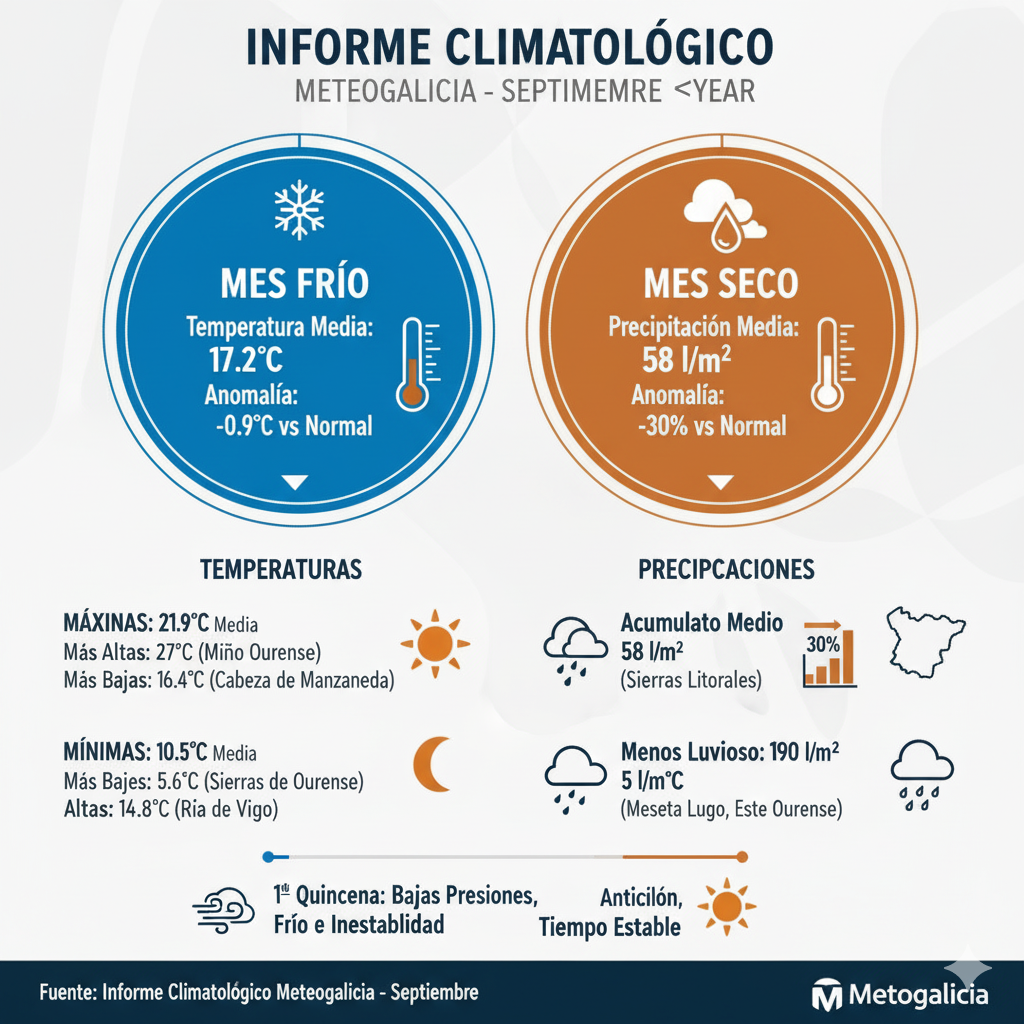 En cuanto a las temperaturas, Meteogalicia determinó que el promedio en septiembre fue de 17,2 ∘C, lo que supone 9 décimas menos que el valor habitual para el mes, consolidándolo como un mes frío.
