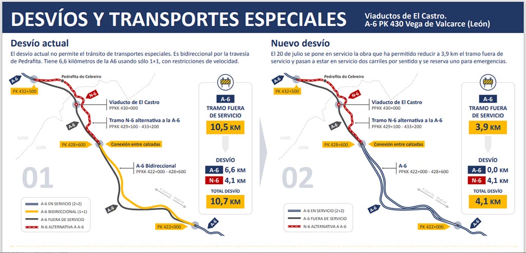 El Ministerio de Transportes, Movilidad y Agenda Urbana (Mitma), con motivo de las obras de reparación de los Viaductos de El Castro, pondrá en servicio a partir de mañana miércoles 20 de julio de 2022 a partir de las 11:00 horas un nuevo desvío desde la A-6 a la N-6 ubicado entre los PP.KK. 428+600 y 432+500 de la citada autovía.