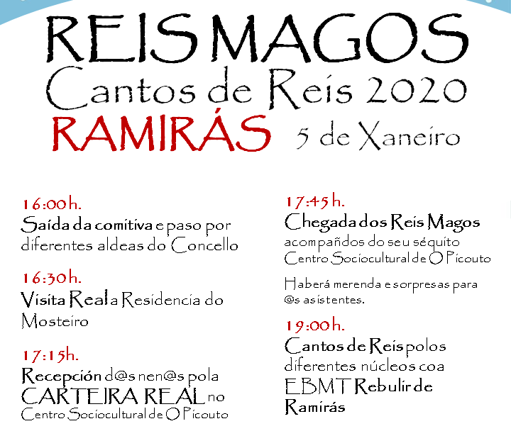 As Súas Maxestades os Reises Magos de Oriente confirman un ano máis a súa visita a Ramirás convidados pola asociación cultural Rebulir e polo Concello de Ramirás. Será o vindeiro Domingo día 5 de xaneiro, e farán un percorrido por diferentes lugares destas terras. Comezarán facendo un roteiro polas aldeas da zona máis alta do Concello, para posteriormente facer unha parada na residencia da terceira idade do Mosteiro e visitar aos seus residentes e familiares. Logo as 17.45 h. acompañados da súa corte e garda persoal, farán a súa chegada nos coches oficiais ao Centro Cultural de O Picouto onde saudarán a nenos e nenas ramirenses. Posteriormente a súa comitiva pasará de novo por diferentes aldeas deste Val do Tuño.