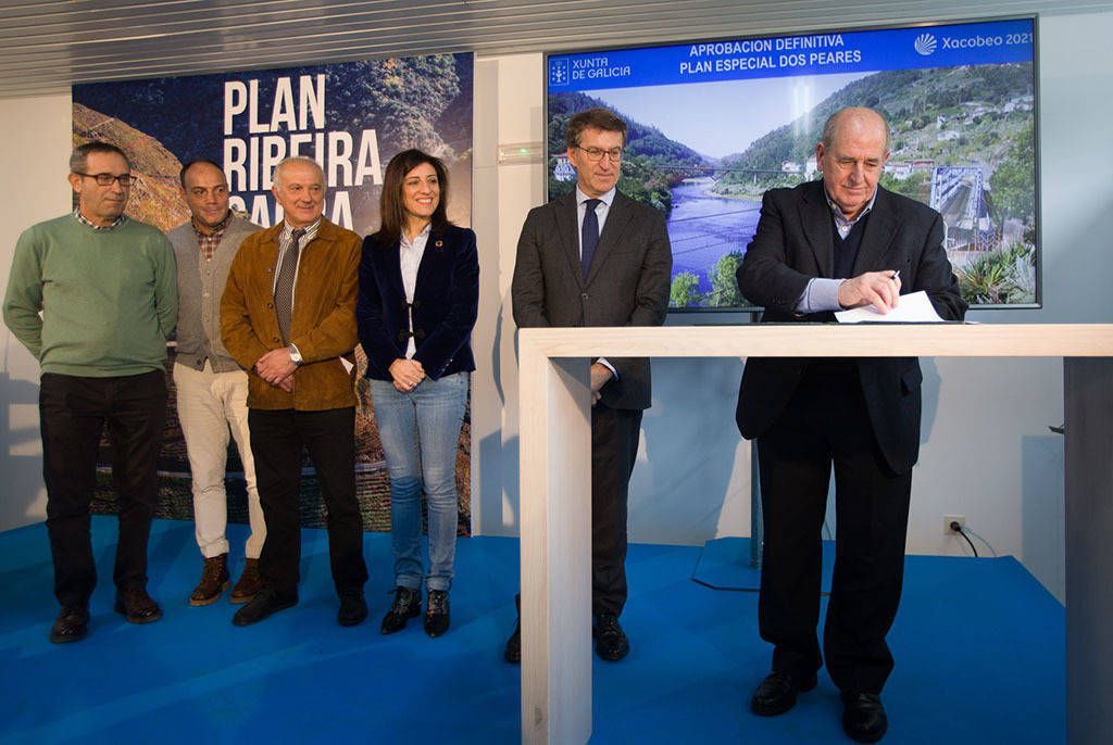 Por outra banda, o titular do Goberno galego tamén foi partícipe da sinatura da Orde de aprobación definitiva do Plan especial de Infraestruturas e dotacións do consorcio local dos Peares, un instrumento de vangarda na ordenación do territorio que, por primeira vez, abrangue 2 provincias e 4 concellos, facendo da complexidade unha oportunidade. Tivo lugar, asegurou, só uns días despois da aprobación no Consello do Proxecto de Lei de ordenación do territorio.