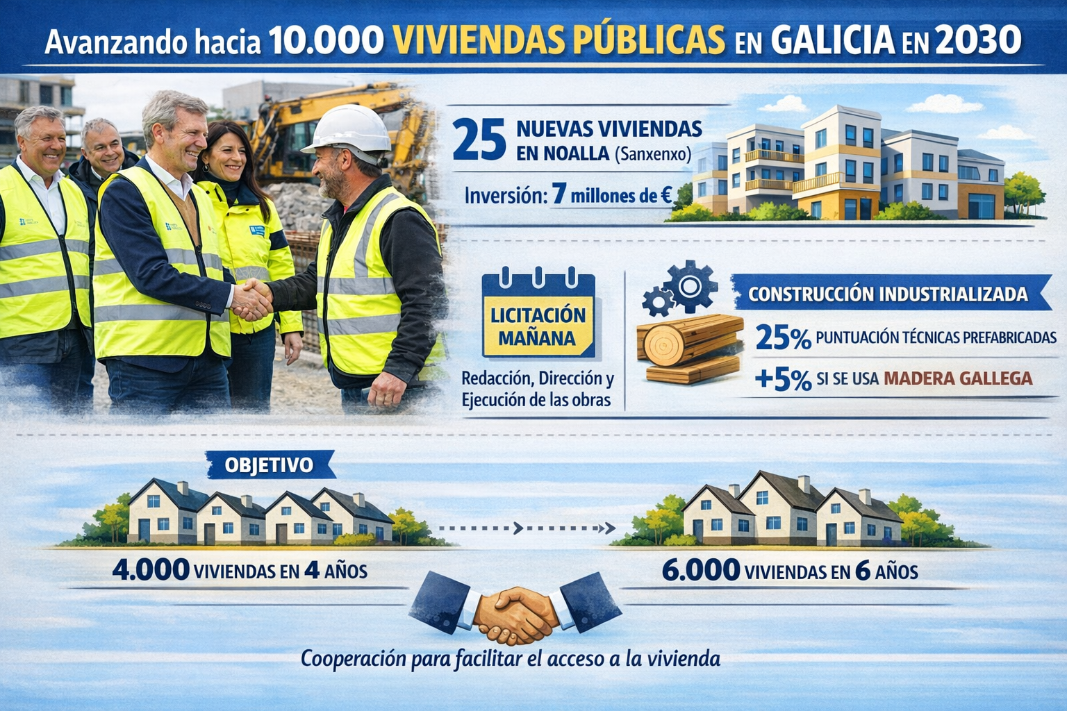 Durante su intervención, Rueda afirmó que “no hay tiempo que perder” y avanzó que la Xunta licitará mañana, en un mismo contrato, la redacción del proyecto, la dirección de obra y la ejecución de los trabajos para estos nuevos hogares. La licitación se publicará en la Plataforma de Contratos Públicos de Galicia, y las empresas interesadas podrán presentar ofertas hasta el próximo 20 de abril.