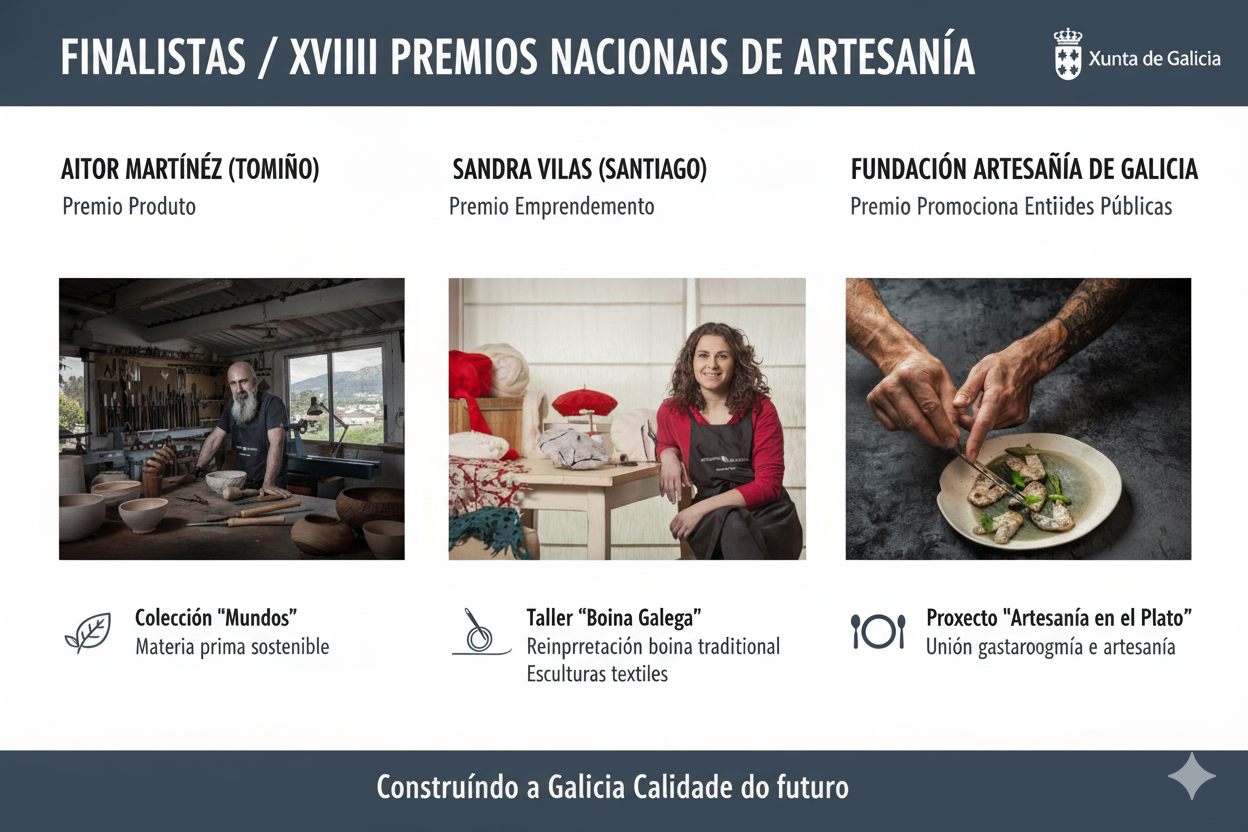 Galicia ha situado a tres candidaturas como finalistas en los XVIII Premios Nacionales de Artesanía, un certamen convocado por el Ministerio de Industria, Comercio y Turismo a través de Fundesarte. La presencia gallega abarca las categorías de Producto, Emprendimiento y Promociona Entidades Públicas, destacando el nivel de innovación, diseño y compromiso social del sector artesano de la comunidad.
