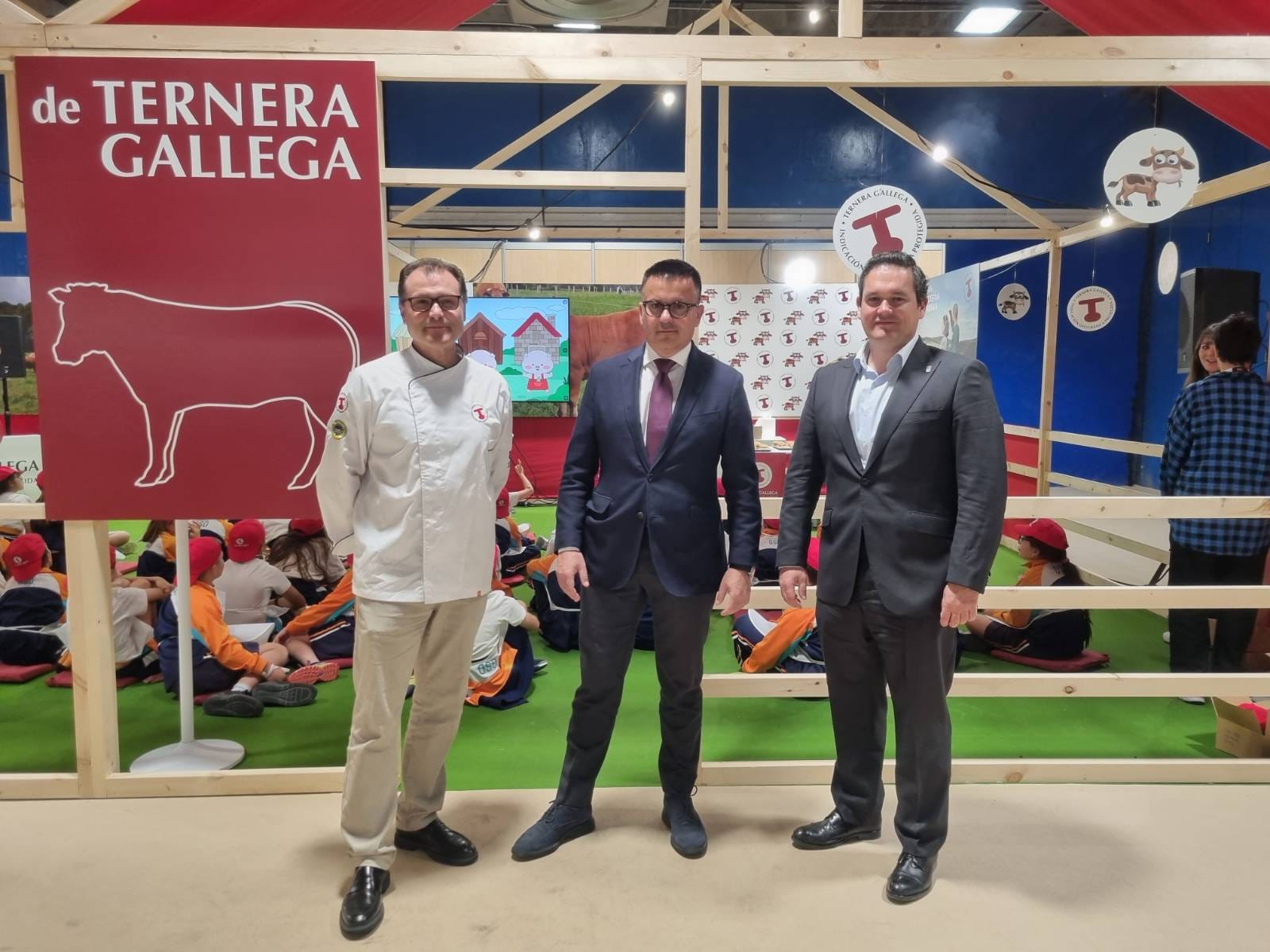 El conselleiro do Medio Rural, José González, acompañado por el director de la Axencia Galega da Calidade Alimentaria, José Luis Cabarcos, asistió esta mañana a un taller infantil para poner en valor la indicación xeográfica protexida (IXP) Ternera Gallega, en el marco de la 36ª edición del Salón Gourmets. El taller está organizado por la Axencia Galega da Calidade Alimentaria en colaboración con el Consello Regulador de las indicacións xeográficas protexidas de Carnes de Vacún de Galicia. Allí, el conselleiro puso de relieve la IXP Ternera Gallega y el resto de indicacións xeográficas protexidas participantes en esta feria.