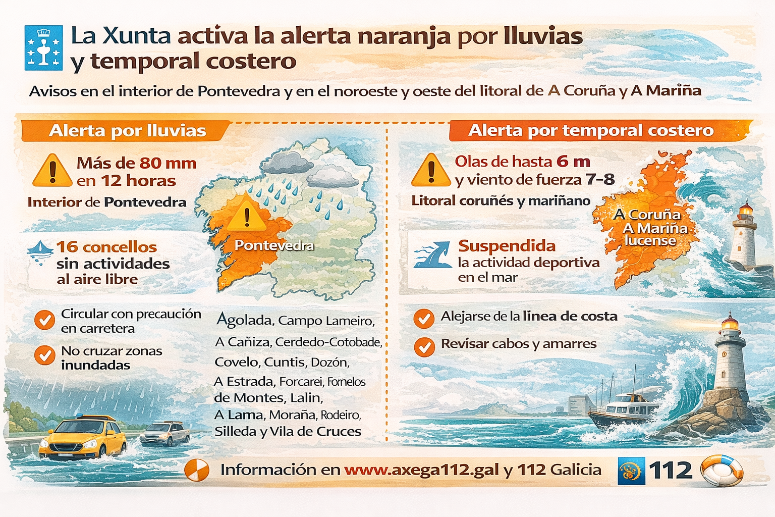 La Xunta activó desde esta madrugada la alerta naranja por lluvia en el interior de la provincia de Pontevedra y anunció que mañana se sumará la alerta naranja por temporal costero en el noroeste y oeste del litoral de A Coruña y en A Mariña lucense. Con el objetivo de garantizar la seguridad de personas y bienes, la Dirección Xeral de Emerxencias e Interior informó de la situación a través del 112 Galicia a los concellos afectados, diputaciones, servicios provinciales, agrupaciones de voluntariado de Protección Civil y clubes náuticos, entre otros.